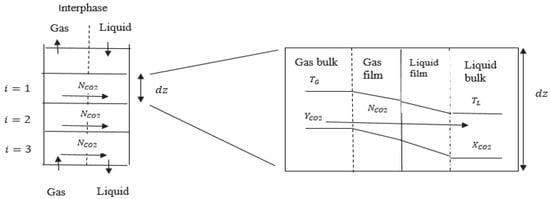 The chemical mole fraction in the solvent may be estimated by calculating the mass balance over the column height step size, as shown in Equation (24):