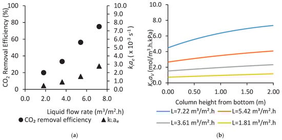 Figure 4a shows that an increase of liquid flow rate from 1.81 to 7.22 m3/m2.h causes the increase of CO2 removal efficiency, and by 55% and 1.90 × , respectively. The enhancement of may be caused by the increase of the wetting surface area between the liquid and gas phases in the column, thus intensifying CO2 removal efficiency and . Another possible factor that contribute to good absorption performance are the turbulence flow regime induced by the liquid flow rate. [7,42,43]. The plotted data indicated that the mass transfer performance of the system was controlled by the mass transfer in liquid phase, where was mainly affected by the liquid flow rate and contact time between the liquid and gas phases [44].