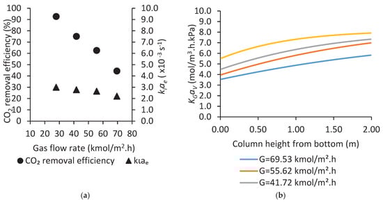 Based on the Figure 5a, once the gas flow rate increases from 27.81 kmol/m2.h to 69.53 kmol/m2.h, the CO2 removal significantly decreases from 92.68% to 44.38%, whereas the value of is reduced from 3.00 s−1 to 2.21 s−1. At fixed liquid flow rate, an increase of gas flow rate resultantly decreases L/G, thus causing the CO2 removal efficiency to decrease. The result on CO2 removal efficiency corresponded well with that of Halim et al. and Abdul Halim et al. [7,30]. Nonetheless, the impact of the gas flow rate on is insignificant compare to the liquid flow rate parameter. This is due to the mass transfer between the liquid and gas phases which mainly depended upon the liquid phase mass transfer resistance [46].