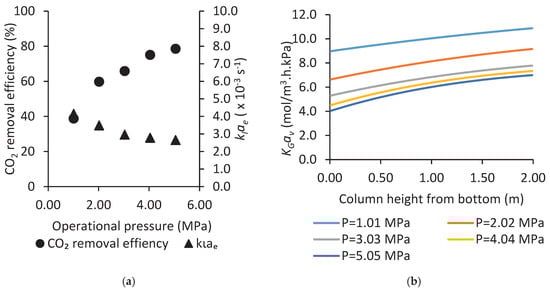 The plotted data in Figure 6a show that if the operational pressure rises from 1.01 MPa to 5.05 MPa, the CO2 removal efficiency is enhanced from 38.80% to 78.57%, while value slightly decreases from 1.01 MPa to 3.03 MPa and behaves constantly from 3.03 MPa to 5.05 MPa. With respect to similar CO2 concentration, an increase of operational pressure will directly increase CO2 partial pressure. Therefore, the trend of the plotted CO2 removal efficiency can be related to the two-film theory, where the mole fraction driving force for separation will increase with increasing CO2 partial pressure. Based on Figure 6a, it is perceived that is slightly lower at the higher operational pressures. This may cause by the restricted diffusion between CO2 in gas phase and amount of reactive PCGLY in the liquid phase.