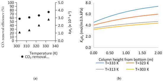Figure 7b shows the profile across the column height at liquid inlet temperature range between 303 to 333 K. A substantial decrease of values can be perceived at T = 333 K. This is due to increasing reaction kinetic between CO2 in gas phase and PCGLY from the top of the column which consuming chemical enhancement, E in the absorption system. As observed, values reduce with increasing liquid inlet temperature. This is mainly contributed by the increasing reaction kinetics caused by the increasing liquid temperature [41,49]. According to the Arrhenius expression, higher temperatures will increase kOH and kGLY, in turn resulting in the increase of reaction rate. Conversely, the higher temperatures reduce CO2 solubility, as indicated by the increase in the Henry’s law constant [21,50]. Nevertheless, the effect of increasing the reaction rate constant overrides the effect of increasing the Henry’s law constant [50]. In turn, CO2 removal efficiency and increased with increasing inlet liquid temperature.