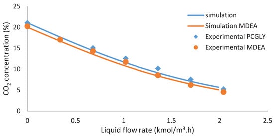 Figure 4a,b represents the effect of liquid flow rate on CO2 removal efficiency, and value. The experiments were performed under operating conditions 41.72 mol/m2.h of gas flow rate, 4.04 MPa of operational pressure with 20 mol% of CO2 concentration in NG, and 333 K of liquid inlet temperature.