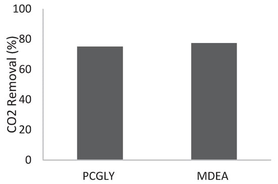 Figure 9 presented the CO2 removal efficiency of PCGLY and MDEA at 75% and 77%, respectively. The PCGLY performance is comparable in terms of CO2 removal efficiency.