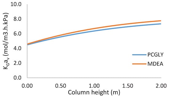 Figure 10 illustrated the overall mass transfer coefficient for PCGLY and MDEA. The of PCGLY and MDEA was evaluated along the column height. It can be observed that of MDEA is comparable with PCGLY.
