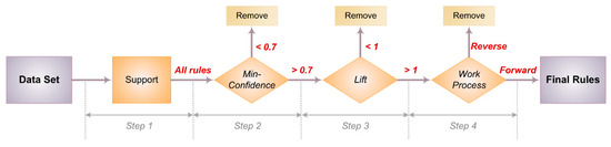 ARM can derive the rules over three steps: (1) users define the min-support of ‘Support’ to select rules beyond the min-support; (2) users define the min-confidence of ‘Confidence’ to select rules beyond the min-confidence value; (3) select rules that the ‘Lift’ value is greater than 1 (i.e., ‘Lift’ > 1). Here, there is no evidence that a specific value is correct because the criteria for the min-support and min-confidence required for the ARM application are arbitrarily set by researchers in consideration of the study purpose and data characteristics [8,19].