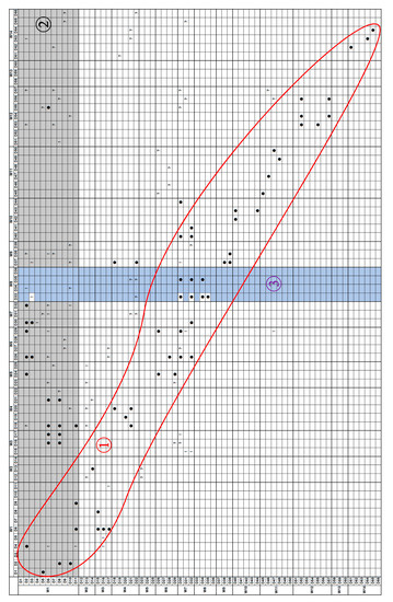As displayed in Figure 3, the “X” value of ARM is marked on the vertical axis and “Y” value on the horizontal axis; the rules of the work type (i.e., Wi) and defect type (i.e., Di) are indicated as “•”, “!”, “?”. In terms of the analysis of the rules, for example, if W1–D2 (i.e., X) occur in the Figure 3 “X → Y” form of ARM, it can be interpreted as “Expected Rule (i.e., “•”) in which W1–D3 (i.e., Y) are generated. From Figure 3, the defect generation rules can be interpreted largely in three ranges arranged by the matrix (see Figure 3, ①, ②, and ③).