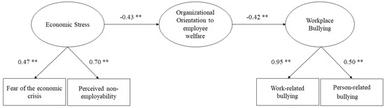 In our study, we argue that one of the most noticeable organizational changes when facing economic recessions and financial difficulties is the decrease in organizational orientation to employee welfare as mentioned above [6,9,13,17]. Therefore, we hypothesize that organizational orientation to employee welfare mediates the relationship between economic stress factors and workplace bullying (Hypothesis 4).