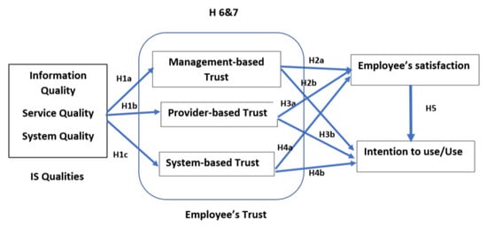 In organizational contexts, researchers found that high management support significantly influences user satisfaction with the system [49,50], and added that satisfaction among hotel employees could be improved by enhancing their perceptions of organizational trust [34]. Hung et al. [25], on the other hand, indicated the importance of the knowledge, quality, and support providers deliver to users in IS success. Accordingly, we posit that employees’ trust in the qualities of IS in addition to their trust in the provider and management support and abilities encourage their satisfaction towards the system, which consequently increases the possibilities of successful IS adoption (Figure 1).