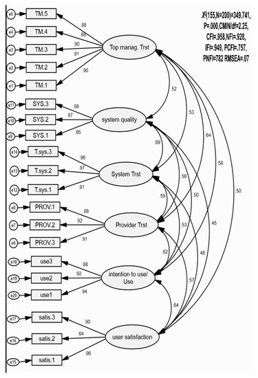 For the purpose of the current study’s objective of investigating the mediating role of trust (senior management, provider-based, and system-based trust) in the relationship between system quality with intention to use/use and user satisfaction, the study executed a partial aggregation procedure [62] on the system quality construct (comprising three dimensions—system quality, service quality, and information quality), whereby a composite average score for every single dimension was calculated to form three variables, named SYS.1, SYS.2, and SYS.3. We employed this factor (system quality) as a partial aggregation and drew it in a second-order manner, as recommended by Bagozzi and Heatherton [62].