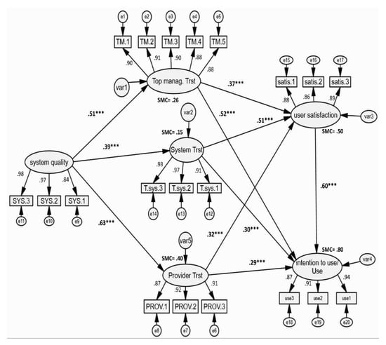 Table 2 presents the goodness of fit indices of the structural model. It can be seen that it shows an acceptable fit to the data (x2/df = 1.371, CFI = 0.986, NFI = 0.950, IFI = 0.983, PNFI = 0.880, PCFI = 0.830, and RMSEA = 0.043) (see Table 3). The SEM results evince support for the current study hypotheses, indicating the mediating role of trust (senior management-based, provider-based, and system-based trust) in the causal relationship between system quality with intention to use/use and user satisfaction.