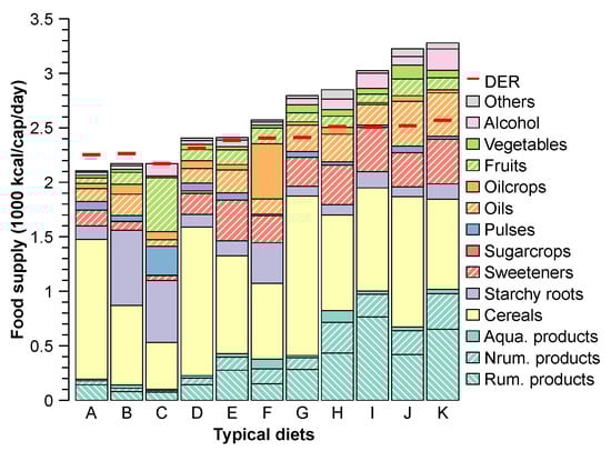Four diets (D–G) contain total calories of between 2400 kcal/cap/day and 2800 kcal/cap/day. These diets are composed of a slightly higher amounts of calories from animal-source foods in comparison to the diets A–C. A mixture of cereals, sugar crops and sweeteners, oil crops and oils, and starchy roots provides a major source of calories in these diets. The protein contents in the diets are relatively low (<60 g/cap/day), except for diet G (≈75 g/cap/day). Diet G also contains a larger amount of cereal compared to the diets D–F (Figures S2–S4). The fat content is less than 70 g/cap/day in these diets, except for the diet F (95 g/cap/day), which consists of a larger amount of oil crops and aquatic products. The food supply in most countries in South America reflects the diets D–G, which was also the case for the Former Soviet Union before 1967 (Figure S5).