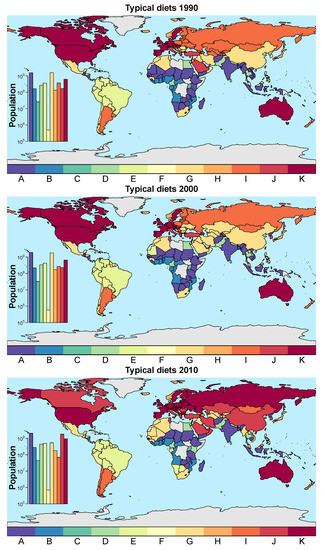 World maps that show spatial distributions of the diets for 1990, 2000, and 2010. In recent decades, countries have mostly shifted from low-energy diets (A–C) to energy-dense diets (H–K). Gray color represents countries with no data.
