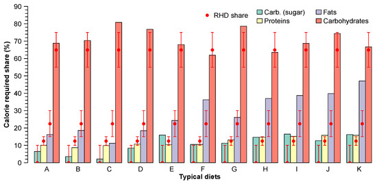 We find discrepancies between the composition of diets and that of the RHD. The diets have either too much or too little food and nutrition supply (Figure 1, Figure 2, Figure 3 and Figure 4 and Figures S3 and S4). In terms of calories, seven out of 11 diets (D, F–K) consist of more than the required calories, which can be interpreted as overconsumption or food waste. The food available for human consumption was 20% higher than the required amount in 2010 on a global scale [10]. The calorie content in two diets (A, B) is less than the required amount (Figure 1). This lower amount of calories reflects a high prevalence of undernourishment and hunger in some countries. Globally, around 821 million people suffered from hunger in 2017 [1].