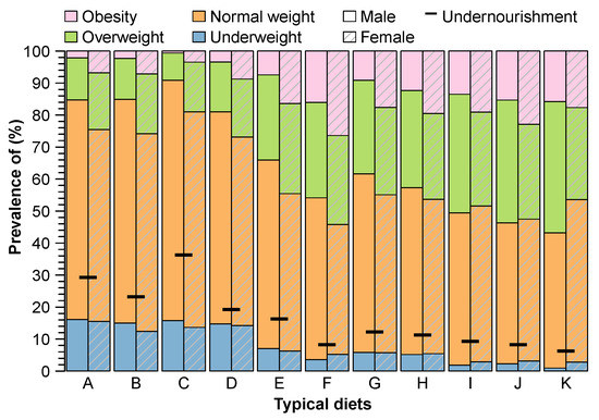 The prevalence of different BMIs varies with diets for both male and female populations (Figure 5). In general, a larger share of females than males suffer from obesity, while a larger share of males is overweight than females. For example, the prevalence of obesity is between 16% and 26% in the female population and between 8% and 16% in the male population in the countries that consume the seven diets (E–K) with calorie supplies of more than 2400 cal/cap/day. These diets consist of a high share of sugar, oils, and animal-source foods, and have a larger prevalence of obesity than underweight. In these countries, 25–40% of males and 25–30% of females are overweight.