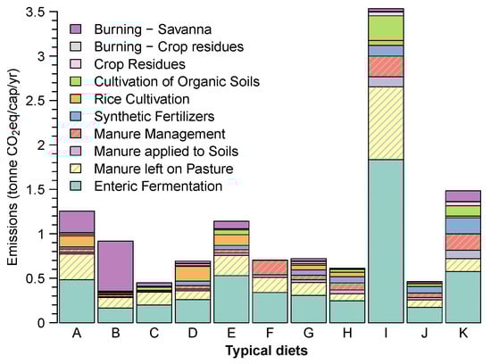 The agriculture sector is one of the primary contributors to anthropogenic greenhouse gas emissions. Thus, embodied emissions of diets play an essential role in determining how sustainable a diet is. We estimate the average agricultural emissions from different sub-domains for producing the typical diets by using the data from FAOSTAT [4] and the method described by Equation (1), considering X as emissions. The different agricultural emission sub-domains are enteric fermentation, manure left on the pasture, manure management, manure applied to soils, synthetic fertilizers, rice cultivation, cultivation of organic soils, crop residues, burning—crop residues, and burning—savanna [31]. The FAOSTAT provides data from agricultural emissions for 243 countries between 1961 and 2013.