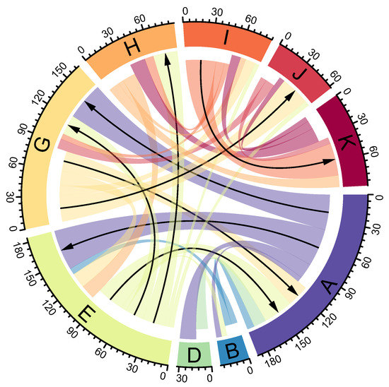 Diet shifts are occurring as a gradual process across the world, which follows similar pathways from low- to high-calorie diets, transitioning through the diets (D–G) that consist of between 2400 and 2800 kcal/cap/day (Figure 7). Although the share of the global population consuming these four diets remained around 22% between 1961 and 2013, the number of people increased from 660 million to 1560 million. Among the four diets, E and G are the main transition points. We observed more than 40 diet shifts from low-energy diets (mostly A) to diets E and G during the last five decades. Similarly, more than 40 diet shifts occurred from diet E and G to energy-dense diets (H–K). Diets C and F are isolated, with one or no shift from and to these diets.