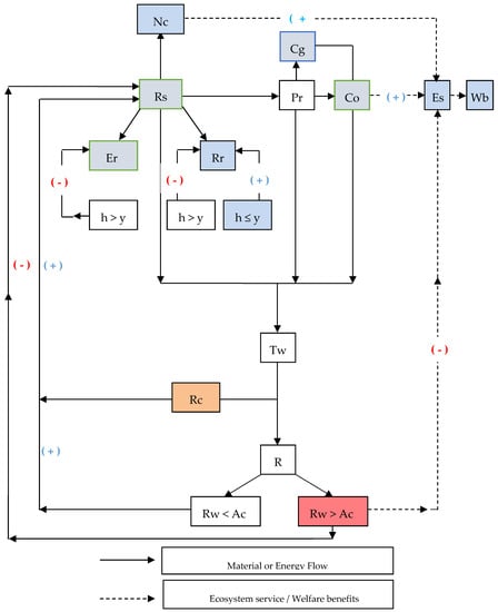Improving natural capital and ecosystem services through recycling [23]. Tw = total waste; Rw = residual waste; Ac = assimilative capacity; y = yield of the resource; Rr = renewable resources; Cg = capital goods; Co = consumer goods; Er = exhaustible resource; Nc = natural Capital; Es = ecosystem service; Pr = productions; Rc = recycling; Rs = natural resources; h = the rate of harvested (extracted or exploited); Wb = welfare benefits. (+) = Positive amenity; (−) = negative amenity.