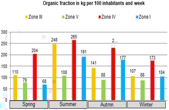 For the decision of the introduction of the separate collection and composting of OHW, it was important to determine the amount of OHW. For the optimization of the separate collection system, it was also important to know the seasonal distribution of the amounts of total waste and the organic fraction. The results in Figure 3 show differences between zones and seasons, which can be explained with the different settlement structure of the zones. These results will, on one hand, allow the improvement of efficiency in the collection system for the total waste amount of 4572 Mg/a in Marneuli. On the other hand, the amount of 2447 Mg/a for the OHW indicates the justification of the introduction of < the innovation of separate collection and composting in Marneuli.