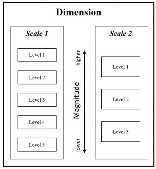 Scales are widely applicable in modern society due to the way the latter is structured [35,36]. The decisions people make, the laws they pass, the rules they follow, the knowledge they exchange, etc. all happen on different levels that are either formally defined or socially created. The meaning of terms like dimension, scale, and level differs depending on where and how they are applied [37,38]. We define them based on Gibson et al. [36], who refer to dimensions as concepts we want to study, scales as measures for different spatial, temporal, quantitative, or analytical aspects, and levels as specific positions on those scales. A schematic illustration of two scales with different numbers of levels is shown in Figure 1. The lower levels on the scales correspond to the lower magnitude of the scale. Accordingly, the higher levels stand for the higher magnitude.