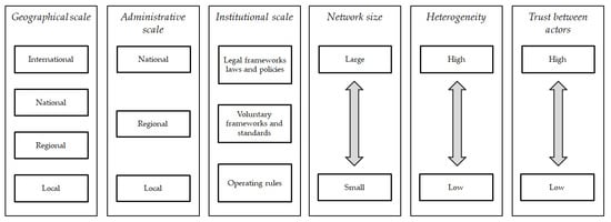Illustration of geographical, administrative, institutional, network, heterogeneity, and trust scales and their associated levels.