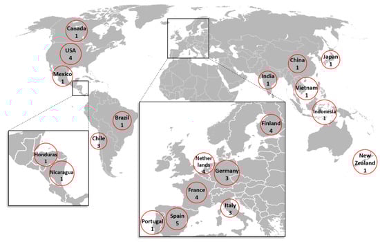 We would like to shortly reflect on the location of the bioclusters in our set of articles and on the bioeconomy sectors they cover. The 42 bioclusters reported in this paper were localized in 20 countries in different parts of the world. Figure 3 presents the global distribution of the bioclusters in our sample of articles.