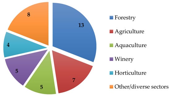 Forest bioclusters, with 13 cases, were prevalent among the case studies. The other sectors were agriculture (seven cases), aquaculture (five cases), wineries (five cases), and horticulture (four cases). The remaining eight bioclusters had either a broad spectrum of bioeconomy sectors or represented a sector that occurred only in that single case study. As it was the case with the spatial distribution of the 42 bioclusters (Figure 3), the distribution in Figure 4 represents neither the whole spectrum of bioeconomy sectors nor their relative sizes.