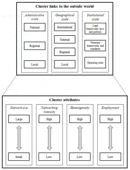 The most commonly used example of a scale in sustainability research is the geographical scale. It is used to measure the spatial range of events and processes [31,33,34,36,37]. The levels on the geographical scale denote the exact specification of the territorial boundaries: these are usually the local, regional, national, international, and sometimes the global levels. For clusters, this scale is relevant to measure their geographical span. Newly emerging clusters are often small and thus local in nature [39], but over time clusters can grow or merge, crossing regional and even national boundaries. The administrative scale includes the various levels of government that influence the cluster through the laws and regulations that apply for the cluster [31,34]. The institutional scale represents the hierarchy of rules, laws, and regulations [31,33,34]. The levels on this scale illustrate how agreements between actors can evolve from some simple informal rules to the formal laws and constitutions. In small emerging clusters, informal rules may suffice to coordinate activities, but as clusters grow in membership, these informal rules often need to become more formalized and codified. These three scales are widely applied in the literature on sustainability, human agency, and social change [31,33,34]. We consider these scales as primary for cluster analysis, because they address the key elements of space, power, and governance.