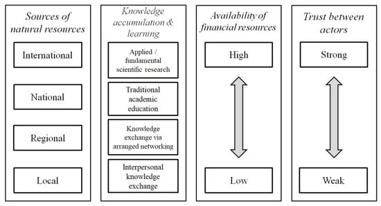 Below, we showcase four scales from our multiscalar framework—sources of natural resources, knowledge accumulation and learning, the availability of financial resources, and trust between actors—because they were retrieved from our case studies (see Figure 6) and not from existing theoretical literature.
