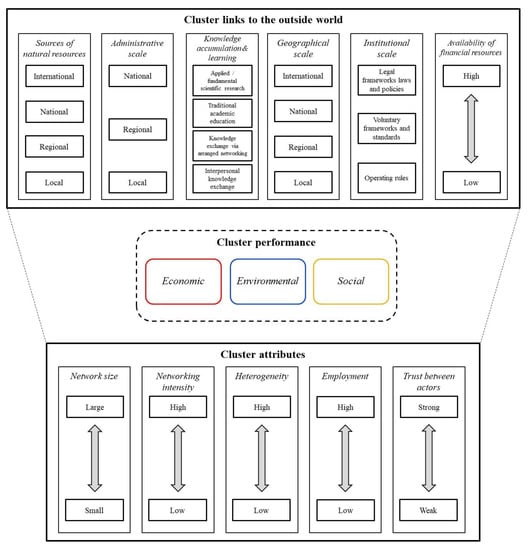 To create the final version of the multiscalar framework, we integrated the four new scales into the different dimensions of the initial framework. The scale of trust between actors was classified into the dimension of cluster attributes, because all the possible levels of this scale relate only to the actors inside the cluster. The three other scales were classified into the dimension of cluster links to the outside world. A biocluster can source its natural resources directly from its locality, or from other regions and countries. The new knowledge in the cluster can be created and exchanged via face-to-face contacts inside the cluster (local buzz), but it can also be created in universities and research centers outside the cluster (global pipelines) [49]. Similarly, the financial resources can be sourced directly among the cluster members. However, different institutions and governmental actors can also be involved in financing the cluster. Therefore, the resulting multiscalar framework is built upon an iterative process of the inclusion of scales applying both the top-down and bottom-up approaches.