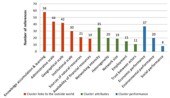 The scales of economic, social, and environmental performance are grouped into cluster performance. However, we caution the reader against interpreting “cluster performance” as another dimension of scales in the framework. As a reminder, the three scales are compilations of multiple economic, social, and environmental effects. These effects can occur within the cluster alone, but they can also play out at higher geographical levels and be connected to other scales that connect the cluster to the outside world. Altogether, we found 379 scale references in the 42 case studies. Their distribution across the 14 scales is shown in Figure 8. We counted 214 references to the scales in the dimension of cluster links to the outside world. Scales in the dimension of cluster attributes were emphasized 100 times. Finally, we counted 65 references to the scales of cluster performance. It is useful to keep in mind that the distribution of the scales in Figure 8 does not imply that, e.g., the availability of financial resources or trust between actors are not very important in the bioclusters. All of the 14 scales were significant enough to be emphasized as many times as they were emphasized, whereas some of them were emphasized more than the others.