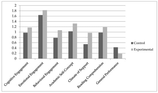 The results confirm, almost totally, our general hypotheses. Data was positive for six of the seven dependent variables analyzed: behavioral and emotional engagement, academic self-concept, perceived climate of support, reading comprehension, and academic achievement. In contrast to expectations, no statistically significant differences were found regarding cognitive engagement. In addition, differences between the experimental and control groups regarding the variables in analysis (e.g., emotional engagement) were larger than those for the other variables (e.g., self-concept). The magnitude of those differences tended to be larger for school engagement (except for the cognitive dimension), perceived social support, and reading comprehension than for academic self-concept or academic performance (particularly the latter).