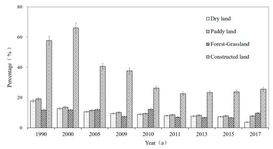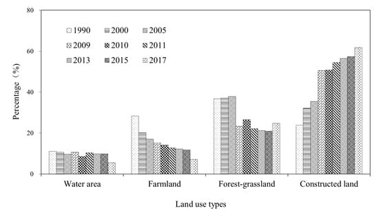 Each land use type exhibited obvious temporal distribution characteristics and periodic differences during 1990–2017 (Figure 2). The areas of farmland decreased constantly while those of constructed land increased rapidly. After 2005, constructed land became the dominant land use type in the region and its proportion had been increased from 23.85% in 1990 to 61.72% in 2017. The area of forest-grassland and water had a decreased trend on the whole. In recent years in China, the emphasis by the government has been placed on environmental protection, and so the area of forest-grassland has been increasing based on the expansion of city afforestation [33]. Between 1990 and 2010, there was a strong transition among the land use types. Then, the transition became relatively stable after 2010. Before 2010, with the reform of administrative divisions in the study area [41], the government strengthened the construction of the Binhu district. Therefore, with the high-frequency exchange among the land use types in the different functional areas of the city, the area of constructed land rapidly increased while the area of farmland gradually decreased. However, since 2010, the growth rate of constructed area has slowed as the structure of each functional area of the city gradually improved when urbanization reached a high level. Thus, the exchange frequency among land use types has decreased gradually.