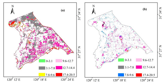 Spatial Variation of the TN Losses Amount in Runoff from Land Use Change during 1990–2017. (a) the Areas with Increased TN Losses; (b) the Areas with Decreased TN Losses. Unit: kg N·ha−1.