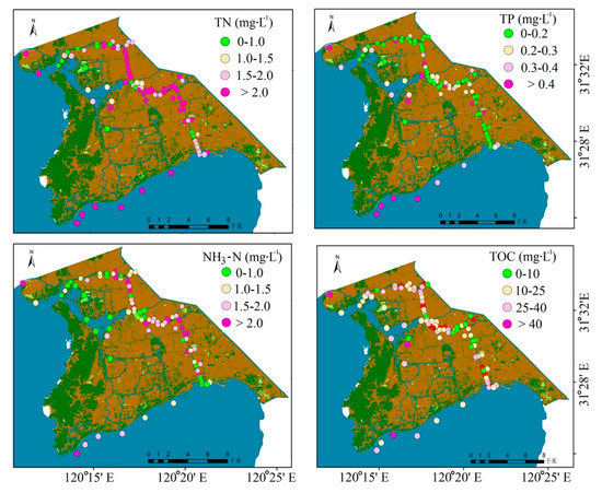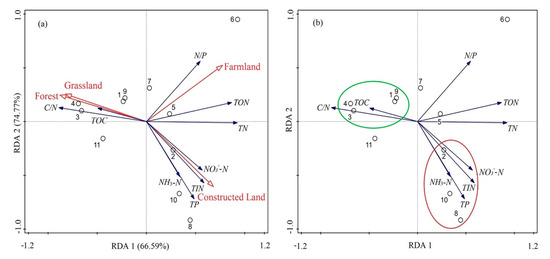 Results of RAD (Figure 6) show that the TN concentration was significantly affected by the farmland and constructed land (F = 4.6, p = 0.006). In view of this, the constructed land and farmland as a nitrogen source aggravated the nitrogen load in the water environment and degraded the water quality. Contrarily, the forest-grassland may absorb nitrogen and purify the waterbody (Figure 6a). As shown in Figure 6b, the sampling sites of clean water were concentrated in green regions, while the polluted water was concentrated in red regions. In this study area, the samples in the green region were distributed in suburbs or wetland parks, the water quality was purified by the biological interception and absorption. The samples in the red region were distributed near the downtown and residential quarters. More nitrogen was discharged into the water environment in runoff due to the increased sewage and inadequate sewage treatment system. Gradually, in the long-term, the nitrogen pollutants were stored in the water and sediment environment, possibly aggravating the water eutrophication under special conditions.