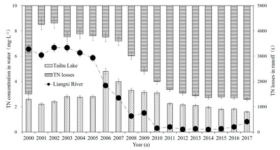 In spatial scale, land use may have dual influences in the water environment. Then, in the long-term scale, we question how the land use change combining with the anthropogenic activities impacts the nitrogen load between the water and sediment. To better deal with this, long-term monitoring data of TN concentrations in Talihu lake and Liangxi River were obtained from the Taihu Basin Authority of Ministry of Water Resources and Taihu Laboratory for Lake Ecosystem Research [37,53]. The annual variations of TN losses have a good consistency with the TN concentrations between the rivers and lake (Figure 7). A downward trend of water nitrogen loads was observed, indicating that the government’s water environment treatment measures achieved a good result [29,31]. But after 2014, the TN concentrations have been increasing in Liangxi River as the hydrodynamic force of this river was mainly controlled by the dam. Larger amounts of pollutants input from the land use were blocked and accumulated in the river. When the dam was open, the clean water flowed through the urban area, the pollutants discharged from the land use were finally transported into the Beijing-Hangzhou Grand Canal (Figure S3). Then, the polluted degree of Liangxi River was alleviated to some extent. This is why the water quality of Liangxi River is better than that of Mali River and Liangtang River on the whole.