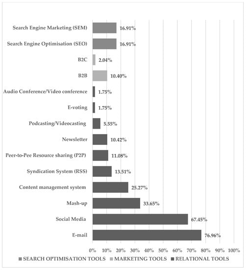A first group of relational tools adopted with a percentage higher than 50% included e-mail (76.96%) and social media (67.45%). As two of the most widespread and popular tools, they represented a fast way for customers to contact firms and ask questions. Moreover, these two tools did not require advanced skills for users and had a time and cost of adoption close to zero.