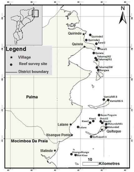 - Hill, N.; Davidson, J.; Silva, I.; Mucave, S.; Muaves, L.; Guissamulo, A.; Debney, A.; Garnier, J. Coral and Reef Fish in the Northern Quirimbas Archipelago, Mozambique – A First Assessment. West. Indian Ocean. J. Mar. Sci. 2010, 8. [Google Scholar] [CrossRef]