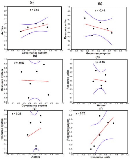 Governance system and Actors were positively correlated, and the same for Resource units and Resource system (Figure 2a,f). However, Governance and the ecological dimension variables—Resource units and Resource system—showed weak negative correlations (Figure 2b,c). The relationship between the Actors and ecological dimensions was not clearly defined with negative and positive relationships with Resource units and Resource system, respectively (Figure 2d,e).