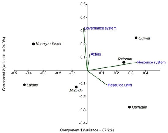 Principal component analysis showing the first and second principal components of social–ecological dimensions for six communities in northern Mozambique. The lengths of biplot lines signify the variance within the social–ecological dimensions while the angle between variables approximates their correlation.
