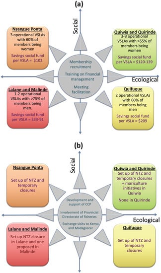 Selection of SES variables intended to bring transformation will depend on the relationships between the community’s social and ecological variables, community acceptability, time and resources [35]. It is also important to acknowledge that social factors like local leadership and community cohesion can make or break an intervention, regardless of the scores of other indicators (e.g., dependence on fishing) [37,66]. This study relies on data collected primarily for project monitoring and evaluation purposes which did not include these variables. In retrospect, initial SES conditions in this study were able to forecast, with some degree of certainty, the success of social and ecological interventions. The successful achievements for ecological interventions in Quiwia and Quirinde were traced to the level of investment in both time and money, and potentially the quality of technical support provided through Global Poverty Action Fund and Our Sea Our Life projects. However, there were unexpected achievements in the two villages, with Quiwia setting up the first temporary closure in 2015 despite having a low exposure to working with NGOs conducting capacity building initiatives, and being quite isolated with lower levels of infrastructure and development compared to neighbouring Quirinde. In Lalane, the technician in charge of the implementation of activities was found to lack enthusiasm and was essentially not implementing the project activities. In Malinde, the Our Sea Our Life project started working only from 2015 and this may explain the low social scores. Thus, the level of technical support, as well as a well-governed and functional community organisation, are also important factors potentially influencing acceptance and success of ecological intervention [37,66].