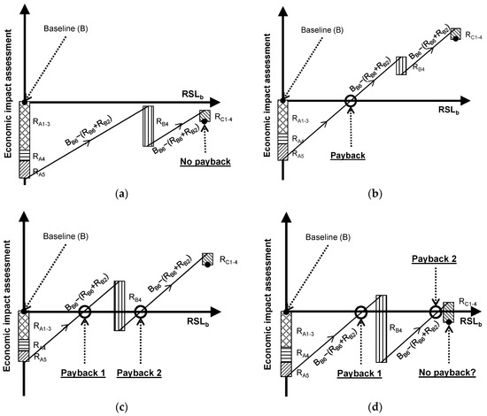 Scenarios when calculating the value of payback with a life-cycle approach: (a) no payback during the reference service life (RSL) of the building; (b) one payback value during the RSL of the building; (c) two different payback values; and (d) two paybacks during the RSL of the building, but with a final negative value.