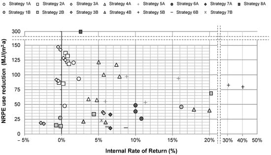 Analysis of the non-renewable primary energy use reduction (NRPER) and internal rate of return (IRR) values of each refurbishment strategy. Numeric values for this figure are available in Table A4.
