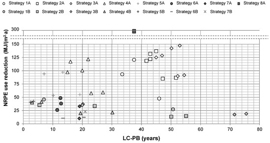 Analysis of the NRPER and life-cycle payback (LC-PB) values of each refurbishment strategy. Numeric values for this figure are available in Table A4.
