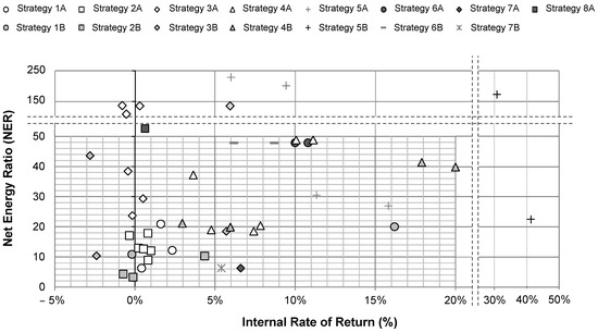 Analysis of the net energy ratio (NER) and IRR values of each refurbishment strategy. Numeric values for this figure are available in Table A4.