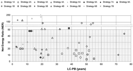 The NER values obtained in this study (see Figure 8) show how, while the vast majority of suggested energy refurbishment strategies have NER values higher than 10 or 20, their IRR value is negative and their LC-PB value exceeds the service life of the building subject to refurbishment. For example, in the case of strategy “3b”, the NER value is 141.3, being one of the strategies with a higher NER value. However, this strategy’s IRR value is negative (−0.7%) and its LC-PB value is 54.5 years. This kind of result shows the need to consider the economic dimension when prioritising refurbishment strategies and not just focusing on one of the environmental indicators.