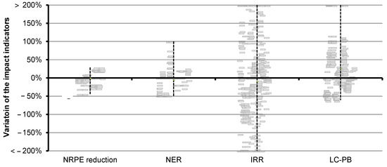 Variation of the NRPE use reduction, NER, IRR, and LC-PB values owing to the new scenarios defined by the sensitivity assessment.