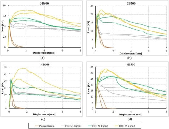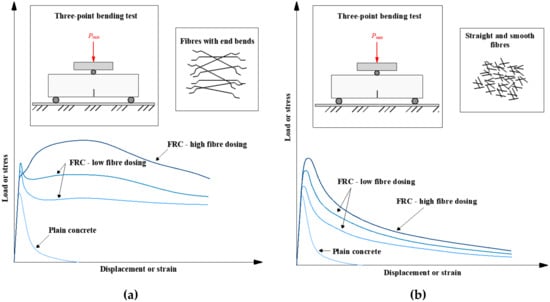 Load–displacement diagram for different types of fiber concrete: (a) Fibers with end bends; (b) straight and smooth fibers.