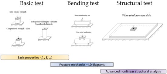Numerical modelling, especially non-linear analysis with the utilization of a finite element method [,,], is an up-to-date and effective tool for structural design optimization. A wider application of numerical modelling in common structural design is limited by our insufficient knowledge of mechanical properties as input parameters for non-linear material models. From this point of view, material characteristics are very important—not only compressive strength but also the modulus of elasticity and split tensile strength. Specific input parameters also include bending tensile strength, fracture energy, and load–displacement diagrams. These material properties can also be determined on the basis of compressive strength. Nevertheless, the accuracy of material properties determined in this way is often inadequate for non-linear numerical analysis. Laboratory testing of fiber concrete is demanding and frequently involves a wide scatter of measured data. A specific issue is the testing of tensile strength and fracture energy [,]. Therefore, in the presented research, we performed an extensive and comprehensive series of laboratory tests (Figure 2).