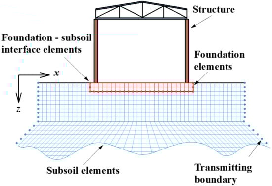 Another aspect of advanced numerical modelling is soil–structure interactions (Figure 3). The interaction model is divided into three parts: Subsoil, foundation structure, and over-ground load-bearing structure. It is necessary to consider the subsoil model and its stiffness [,], as well as the modelling of the surface between the subsoil and the foundation’s structure. The interaction of fiber concrete foundation slab with the subsoil connects two disciplines: The design of concrete structures and soil mechanics [,,].