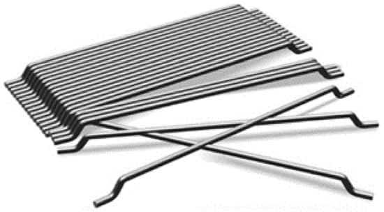 Within the experimental program, identical types of fiber were used in all test samples: Cold-strained steel fibers (3D DRAMIX 65/60BG) [] (Figure 4). The fiber dosage was 25 kg/m3, 50 kg/m3, and 75 kg/m3. A reference variant slab without fibers was also made. The same concrete mixture was used for all fiber dosages; the basic parameters are shown in Table 1. The maximum water–cement ratio was w/c = 0.6, and the minimum cement content was 300 kg/m3. CEM I 42.5 R cement was used, with a maximum grain size of 16 mm. The fiber’s material characteristics are provided in Table 2.